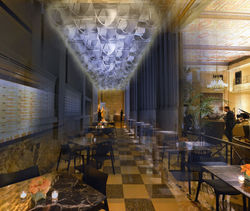 As the Franklin building stands as a heavy building of dense and permanent decor, the contrasting installation that can balance the treatment of space will represent itself as a matrix of simple additive and subtractive cells composed to expose itself, then torques away to expose the dense ceiling hidden above it. It is a sculptural canopy installation in a section of the building’s cavernous double-height residential lobby to highlight and define a newly re-opened bar area. The installation utilizes a modular skeleton with depth to facilitate production of simple and elegant composition of parallel fiber bundles into continuous planes for acoustic and lighting properties.